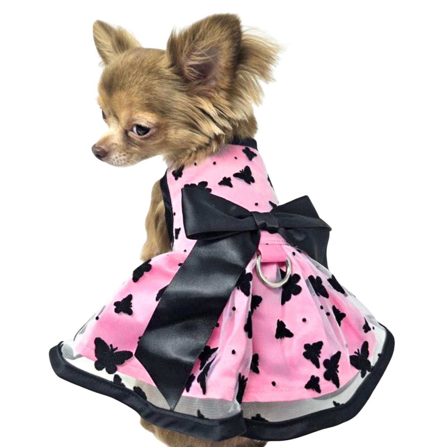 You’ll be all aflutter with this classically elegant harness dress, designed to turn heads wherever your pup goes. Beautifully crafted in soft pink with striking black trim, this timeless piece is finished with a delicate black bow and a sweet butterfly overlay for an extra touch of charm.
