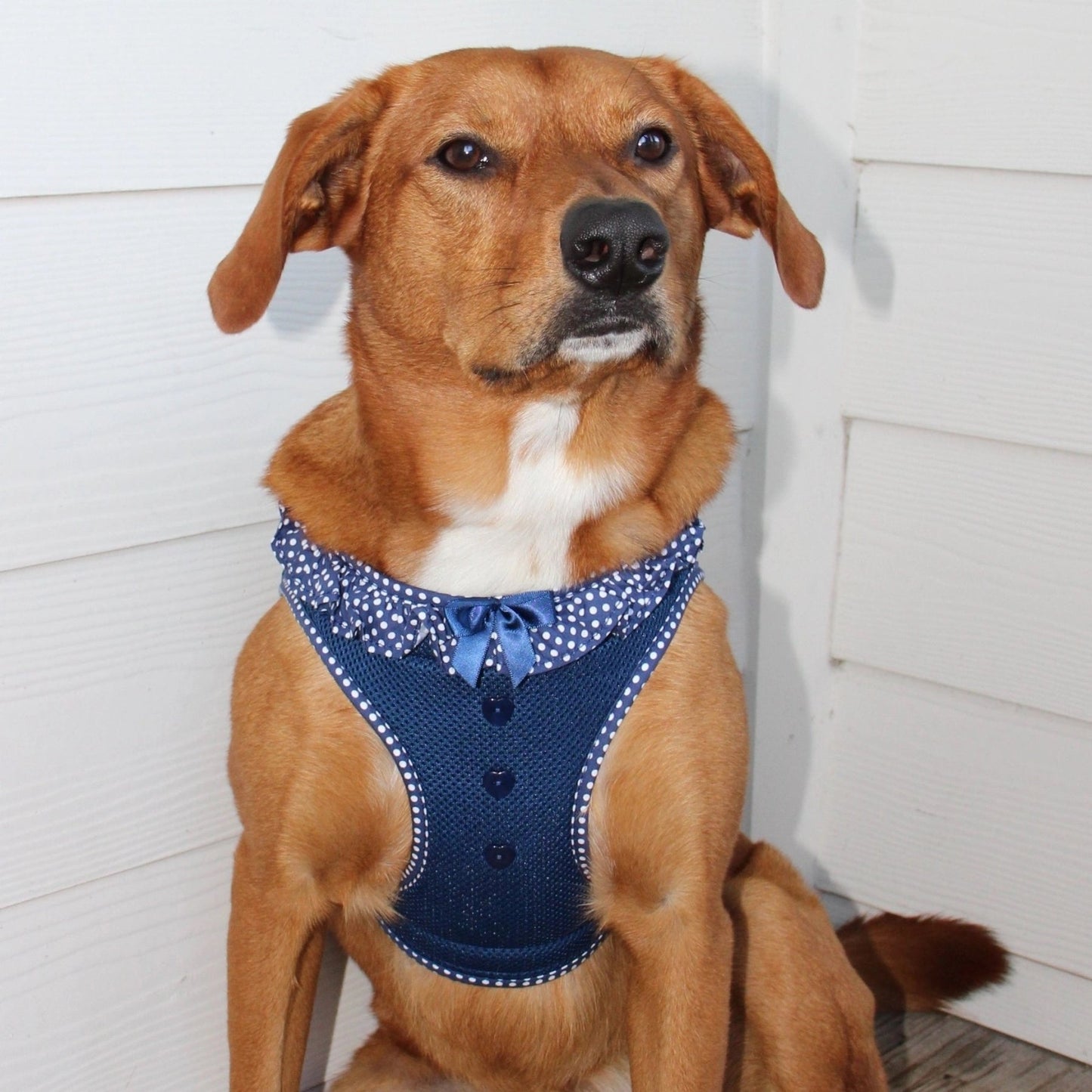 Doggie Design's Navy Polka Dot dog harness is designed for the smaller pooch in mind. It has a gorgeous frill around the neck with a polka a dot trim and finished off with matching heart buttons on the front. These dog harness are perfect protection for your pooches trachea and only pulls on the chest.