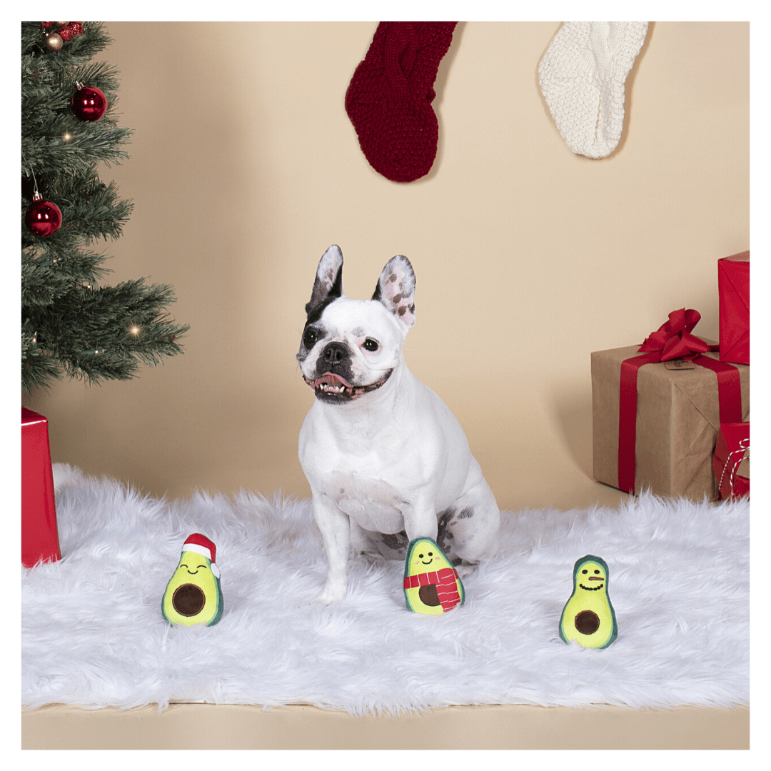 Elevate your pup's festive playtime with this charming collection from Fringe Studio. This exclusive three-piece set features whimsically reimagined avocados dressed in holiday attire—complete with a cheerful Snowman Avocado, jolly Santa Avocado, and a cosy Scarf-adorned Avocado. Each plush toy is thoughtfully crafted with an embedded squeaker, providing auditory engagement that keeps smaller dogs entertained and mentally stimulated. The soft, durable construction ensures these festive companions withstand enthusiastic play sessions whilst remaining gentle on delicate teeth and gums. Perfect for toy-loving small breeds, this set combines playful design with quality craftsmanship, making it an ideal addition to your dog's toy collection this holiday season.